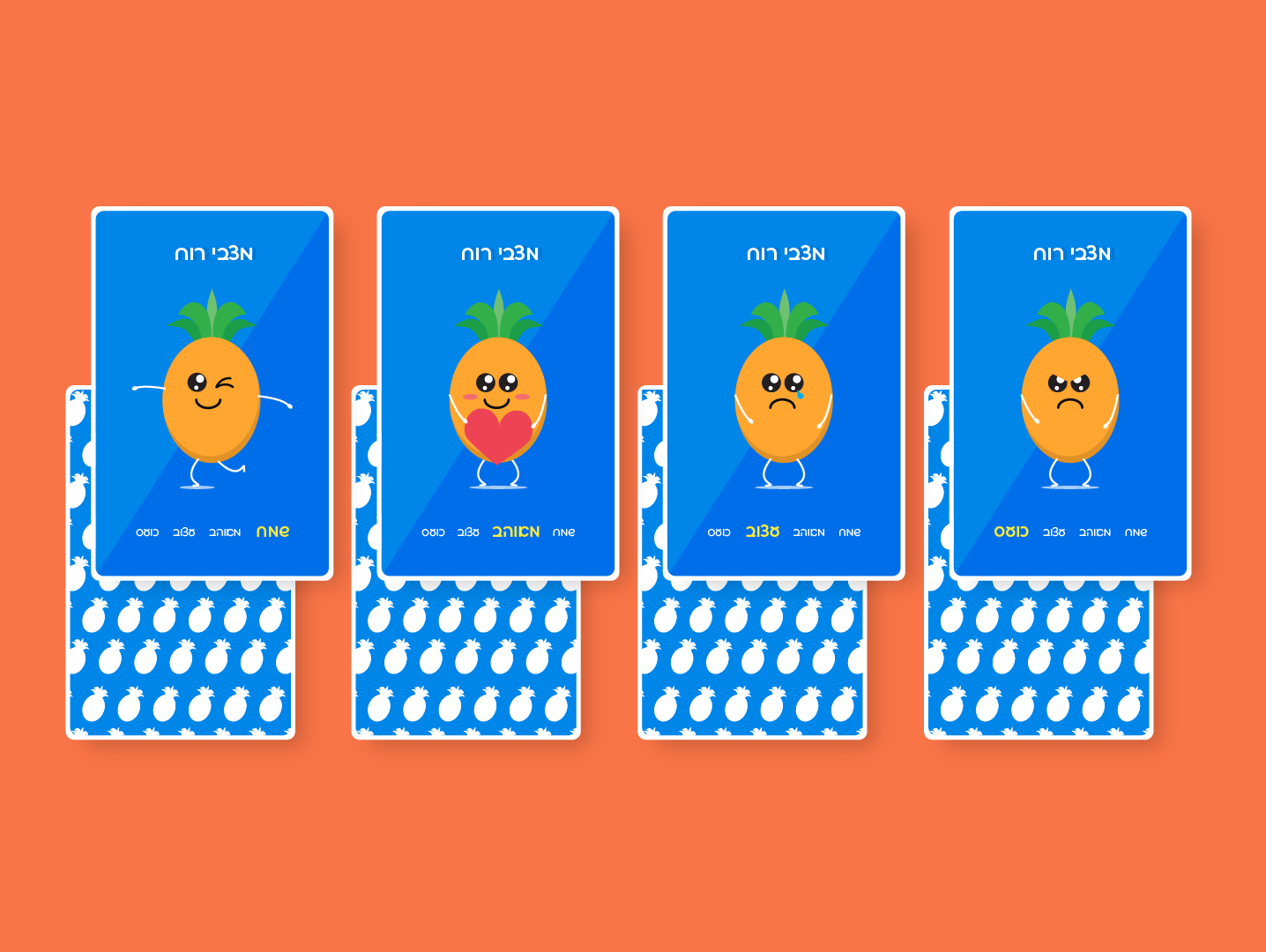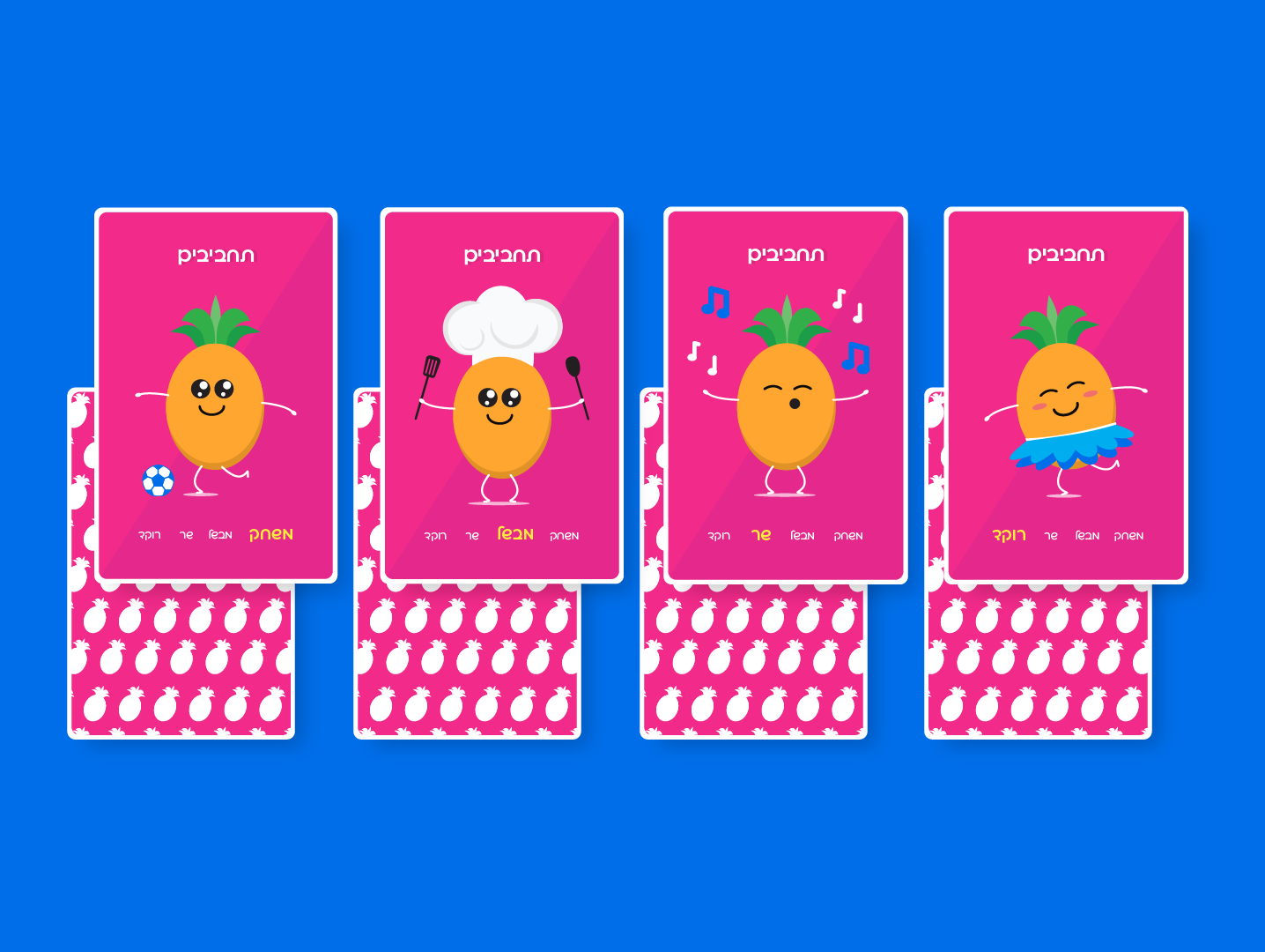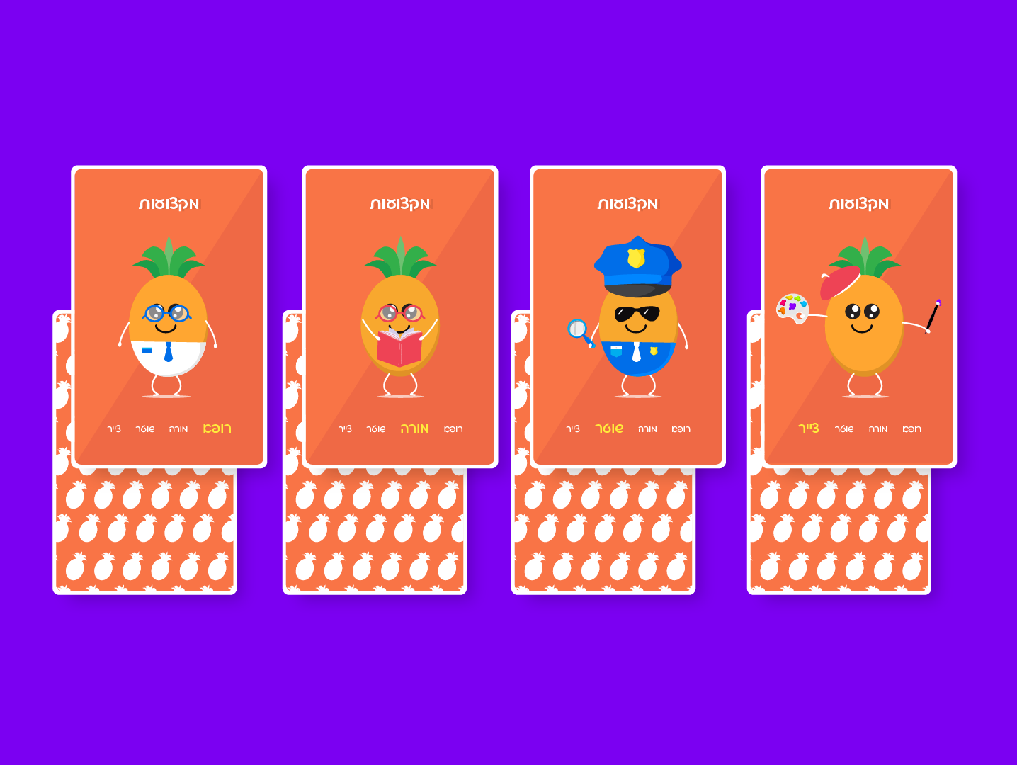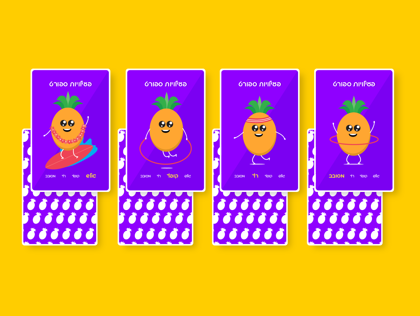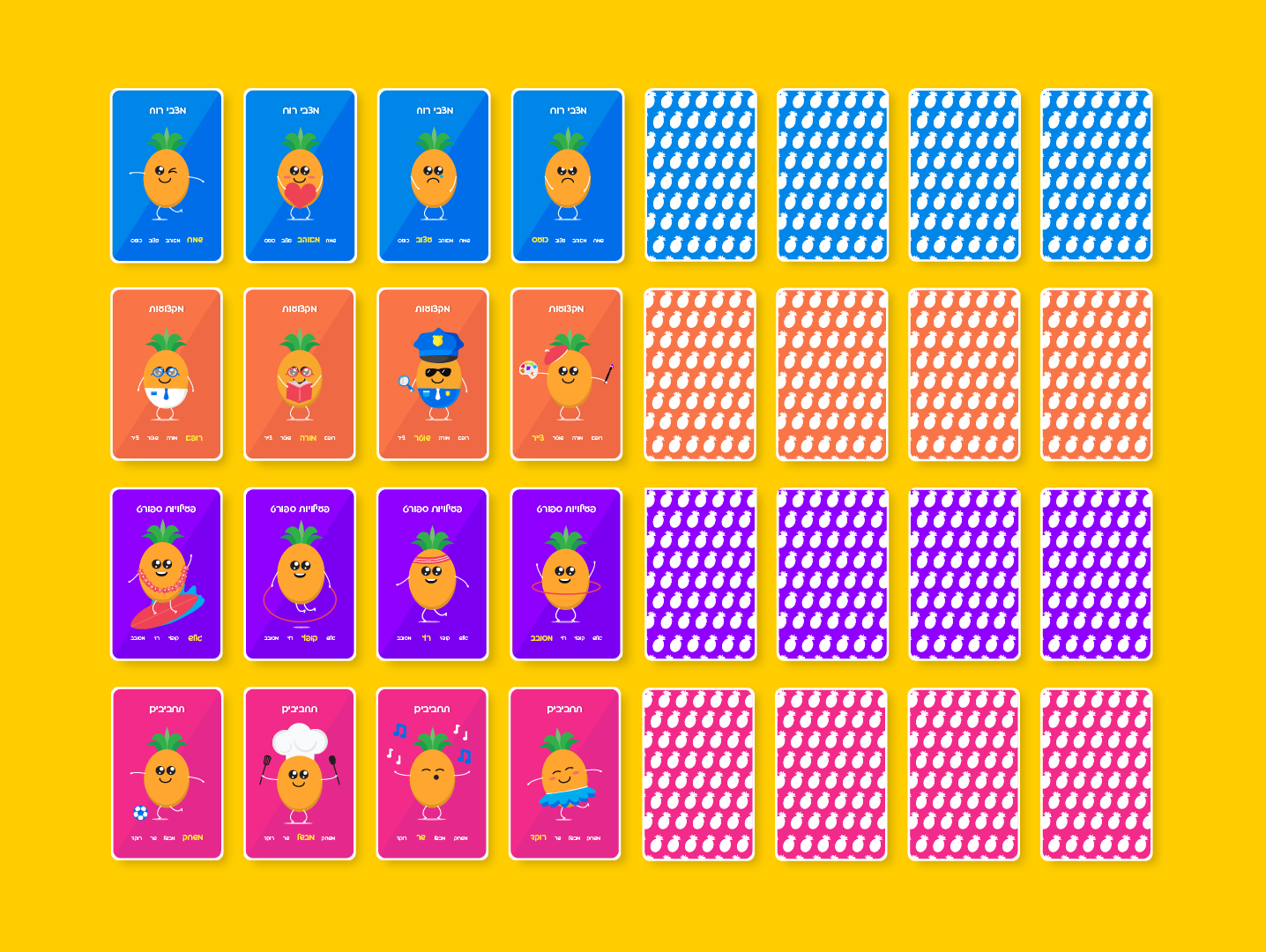 An illustrated “quartet” card game featuring a playful pineapple character in four themed sets, each with distinct expressions for a cohesive and engaging children’s game.
